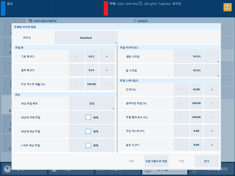 [트랩 폭], [트랩 어피어런스], [화상] 및 [트랩 스레시홀드] 창에서 트래핑 설정을 정의합니다.