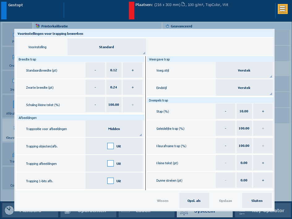 Als u ongewenste witte randen tussen gekleurde vlakken opmerkt, gebruikt u een voorinstelling voor trapping om de verbinding tussen de gekleurde vlakken te corrigeren. Een voorinstelling voor trapping is een verzameling trappinginstellingen voor een opdracht of subset van een opdracht. Gebruik de editor voor het maken van uw eigen voorinstellingen voor trapping. U kunt een voorinstelling voor trapping selecteren voor een afdrukopdracht.