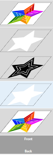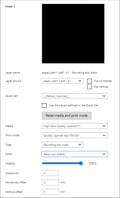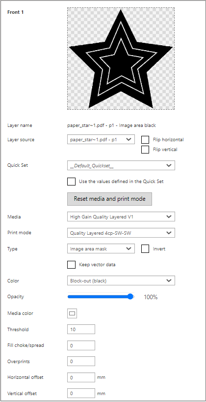 En este ejemplo creamos un trabajo de impresión en material transparente que será visible por ambos lados. El blanco se utiliza para impedir que el otro lado brille a su través.