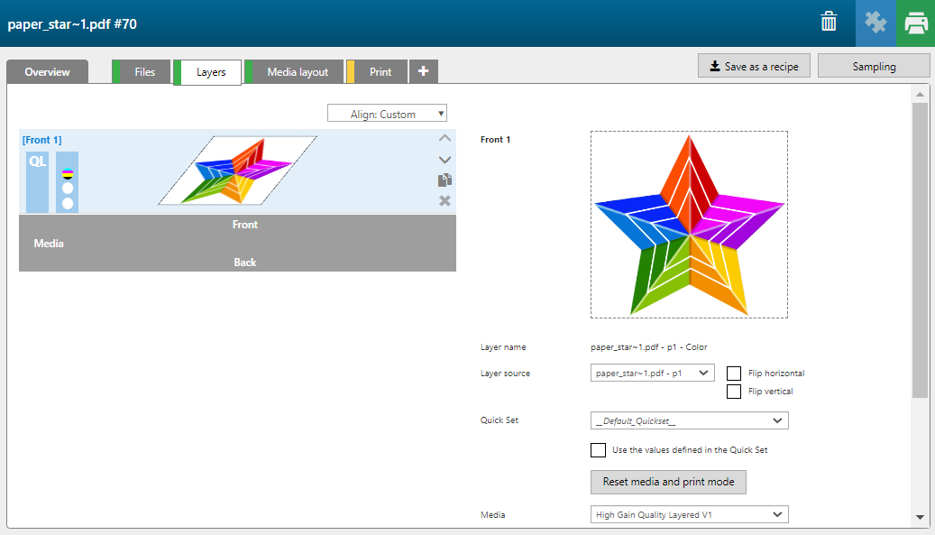Con [PRISMAguide XL] puede crear trabajos de impresión con tinta blanca, sin necesidad de un preproceso exhaustivo en Adobe Photoshop o Adobe Illustrator. No es necesario que los colores directos tengan un nombre específico, las capas para datos blancos estén en la parte superior o la sobreimpresión esté activada.