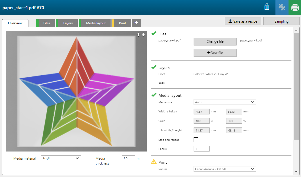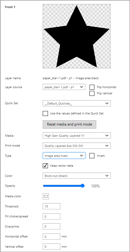 In dit voorbeeld maken we een afdrukopdracht op transparant materiaal, die aan beide zijden zichtbaar zal zijn. Wit wordt gebruikt om ervoor te zorgen dat de andere kant niet doorschijnt.