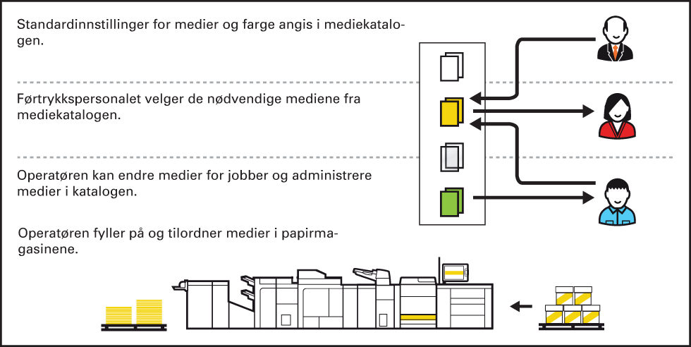 Mediebasert arbeidsflytUnder den første konfigurasjonen av utskriftssystemet er mediekatalogen fylt med medier og medieinnstillinger.