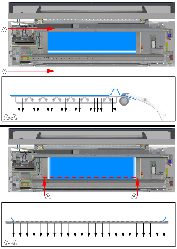 Увеличьте значение параметра [Vacuum power] в RIP. Увеличение с шагом 10%. Для каждого шага, для которого вы увеличили и изменили значение параметра: перезагрузите носитель, прежде чем продолжить вывод данных на печать. Сначала проконтролируйте движение носителя на тигле, прежде чем вновь увеличить мощность вакуума.