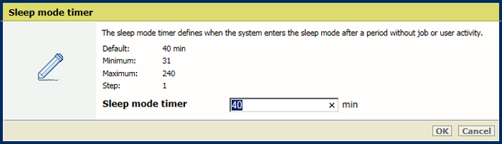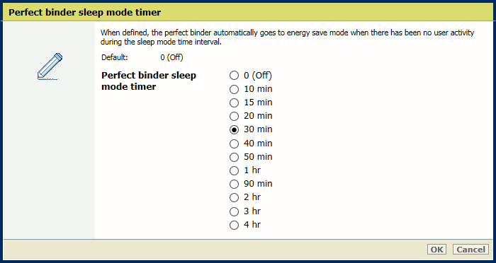 Utilisez le paramètre [Horloge du mode veille de l'unité de reliure dos carré collé] pour définir le délai après lequel l'unité de reliure sans couture entre en mode veille.