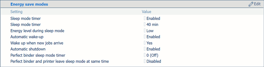 Paramètre [Horloge du mode veille de l'unité de reliure dos carré collé] Utilisez le paramètre [L’imprimante et l’unité de reliure dos carré collé sortent du mode veille en même temps] pour indiquer que l’unité de reliure sans couture quitte le mode veille lorsque l’imprimante en fait autant.
