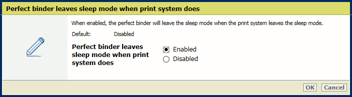 [Perfect binder sleep mode timer] settingUse the [Perfect binder and printer leave sleep mode at same time] setting to indicate whether the Perfect Binder leaves the sleep mode when the printer does.