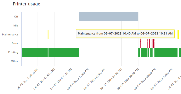 A(z) [Idővonal] nézet idővonalon jeleníti meg a nyomtató használatára vonatkozó adatokat. A nézet segítségével az elmúlt 30 napon a nyomtatónál bekövetkezett eseményeket elemezheti.