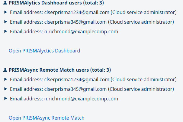 New added cloud service administratorThe new cloud service administrator is also added to the lists of PRISMAlystics Dashboard and PRISMAsync Remote Match users.