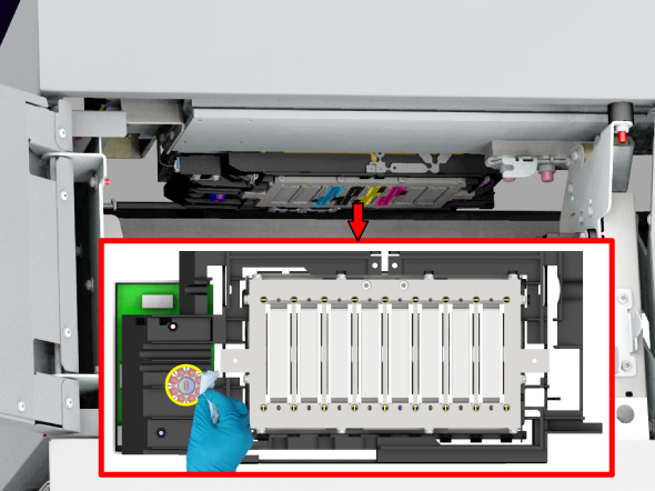 Při práci, kdy hrozí kontakt s inkoustem nebo materiály pro údržbu, noste předepsané ochranné rukavice. Rukavice musí být vždy převléknuty přes rukávy. V zájmu zabezpečení maximální bezpečnosti striktně dodržujte pokyny v bezpečnostních datových listech (SDS).