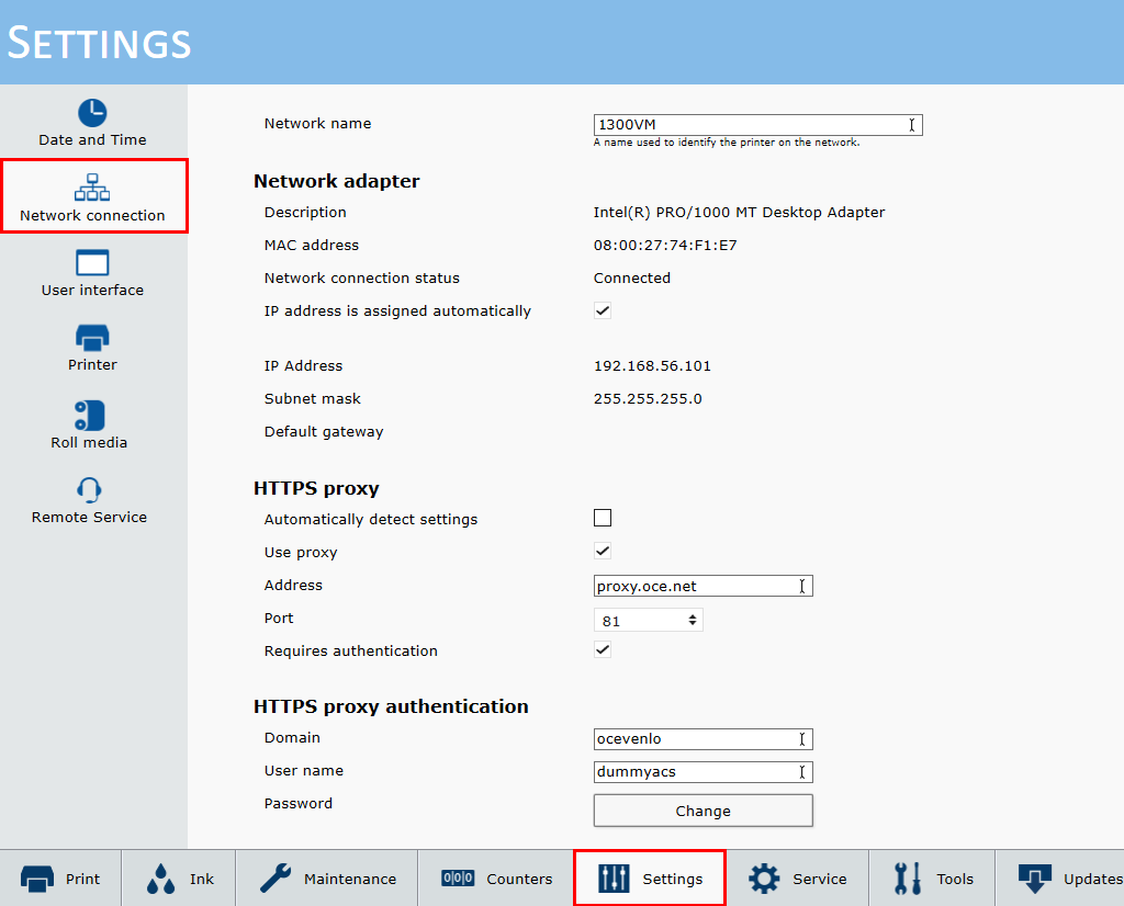 1. På operatørpanelet klikker du på [Settings][Network connection].