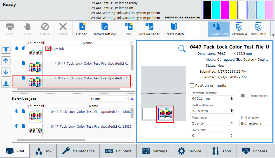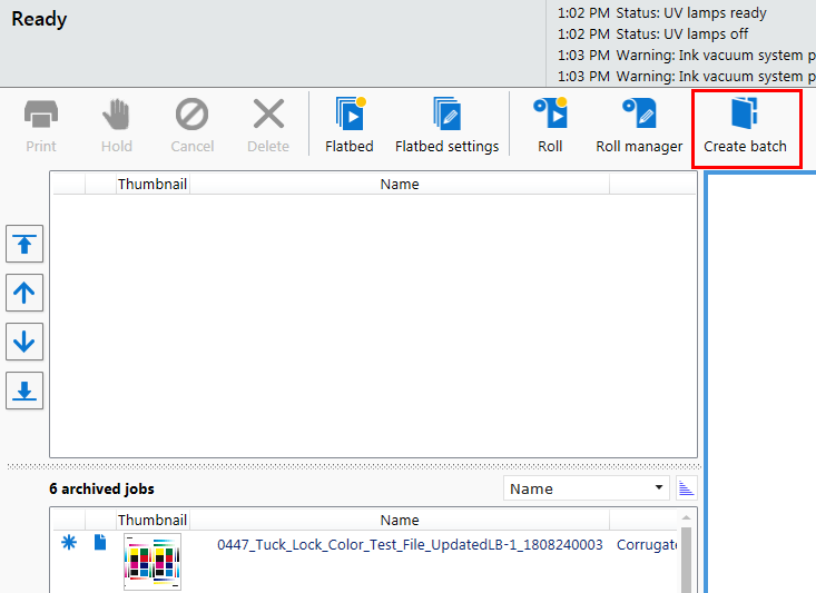 In de batchmodus Verzamelen wordt een set met afzonderlijke printopdrachten op individuele stukken materiaal geprint en wordt dit eventueel herhaald voor het aantal exemplaren in de set. De balk verplaatst zich tussen elke printopdracht naar de parkeerpositie, er wordt van materiaal gewisseld, de materiaaldikte wordt bevestigd, en vervolgens moet de startknop of het pictogram Printen starten worden ingedrukt om het volgende exemplaar te printen.