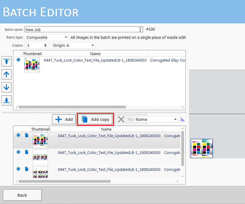 [Exemplaar toevoegen] voegt een exemplaar aan de batch toe. De opdracht blijft in de wachtrij staan.