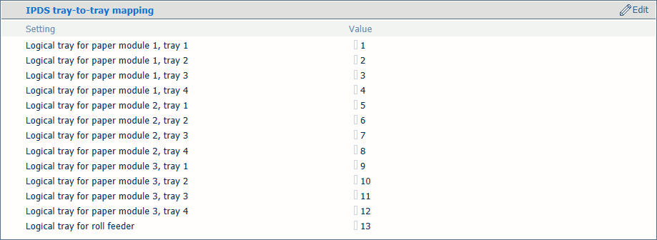 [IPDS tálcából tálcába leképzés] beállításokAdja meg a logikaitálca-értéket az összes fizikai papírtálcánál, amelyeket a munkák használnak.