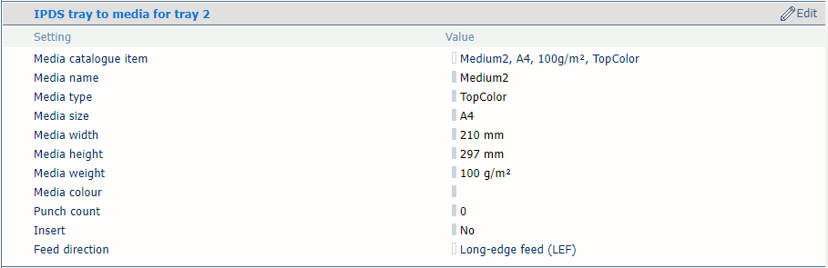 트랜잭션 인쇄 작업은 항상 Settings Editor에 지정된 용지 정의를 사용합니다. [트레이에서 트레이로] 또는 [미디어 투 트레이] 을(를) 선택합니다. IPDS 데이터 스트림에는 논리적 트레이에 대한 참조가 포함되어 있습니다. 물리적 용지 트레이([트레이에서 트레이로] ) 또는 용지 카탈로그([미디어 투 트레이] )의 용지에 할당할 수 있는 36개의 논리적 트레이가 있습니다. |