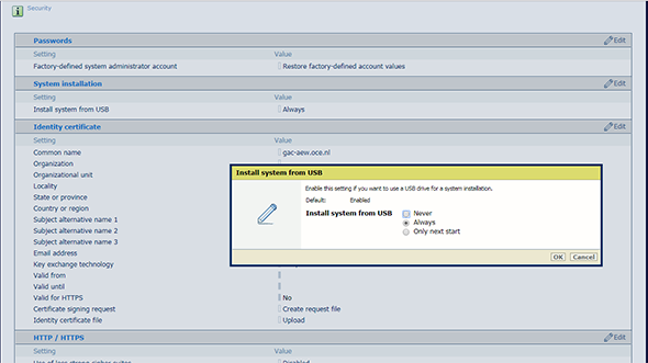 Instalaci z paměti USB provádí servisní technik za účelem instalace systému nebo jeho opětovné instalace. Instalaci z USB je rovněž z hlediska zabezpečení zakázat.