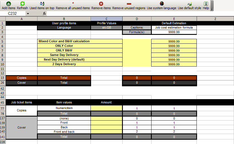 Neste procedimento, é criada uma fórmula totalmente nova na coluna Z da folha de cálculo "CostSheet". A nova fórmula baseia-se em dois [Itens da folha-de-trabalho]: [Cópias] e [Capa]. Neste exemplo, os dados da fórmula na coluna E são utilizados como ponto de partida para a fórmula na coluna Z.