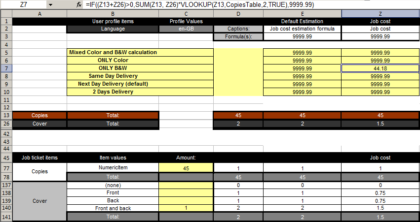 在此过程中,将在“CostSheet”工作表的第 Z 列中创建一个全新的公式。新公式基于以下两个 [作业票证项目] :[份数] 和[封面] 。在此示例中,将第 E 列中的公式数据作为第 Z 列中的公式的起点。