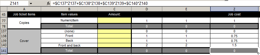 Neste procedimento, é criada uma fórmula totalmente nova na coluna Z da folha de cálculo "CostSheet". A nova fórmula baseia-se em dois [Itens da folha-de-trabalho]: [Cópias] e [Capa]. Neste exemplo, os dados da fórmula na coluna E são utilizados como ponto de partida para a fórmula na coluna Z.