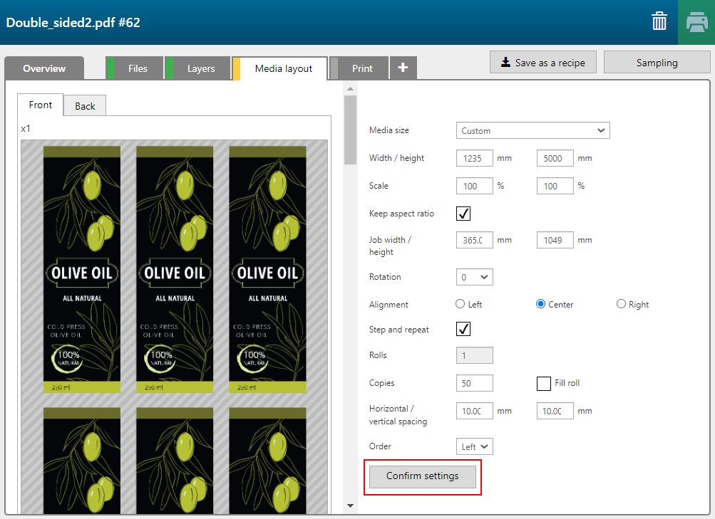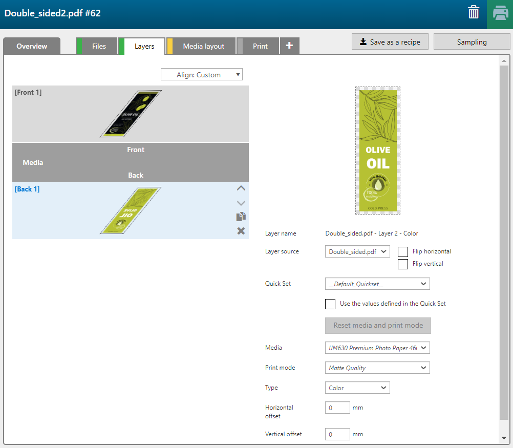 Das Rezept 'Double sided' besteht aus 2 Schichten, eine für die Vorderseite und eine für die Rückseite des Mediums.