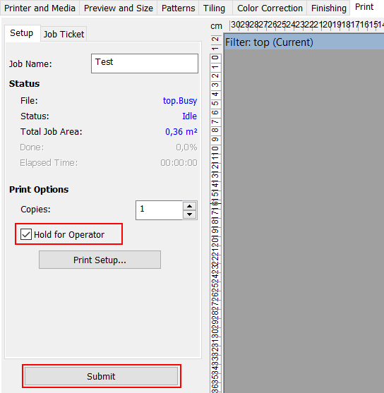 Option Hold for Operator (Mettre en attente pour l'opérateur)Soumettez le travail d'impression (c.-à-d. via un traitement/RIP).