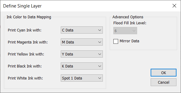 La définition de calque « Custom » (Personnalisé) permet au client de mapper la couleur d'encre aux données et de configurer des options avancées permettant de sélectionner la quantité de remplissage de l'imprimante ou la mise en miroir des données.