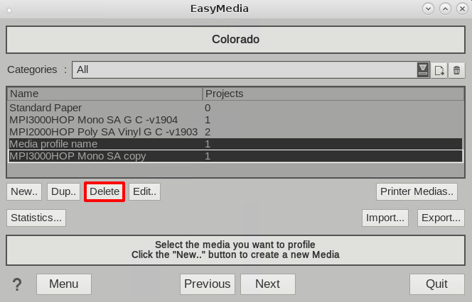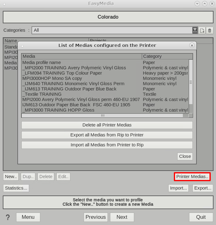 Alle materiaaltypes in de printer worden verwijderd, dit betreft ook materiaaltypes die via andere RIP's werden toegevoegd.