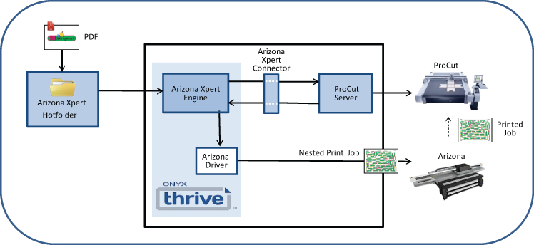 可以设置自动化工作流程。用户可以将文件拖放到 Hot 文件夹中来生成真实形状嵌套的 ProCut 作业,然后在 ONYX Thrive 中应用 PRISMAguide XL 配方并最终在 Arizona 打印机上打印。可以将 Hot 文件夹配置为自动提交作业到 ProCut。
