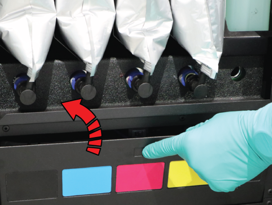 A szűrők légtelenítése egy 60 ml-es fecskendővel történik. Ha a légtelenítés egy festéktasak cseréje után történik, várja meg a festéktöltés végét a légtelenítéssel. A szűrőket álló nyomtató mellett kell légteleníteni, vagyis amikor nincs folyamatban nyomtatás.
