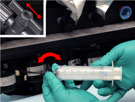 Lépésekben húzza hátra a fecskendő dugattyút, és a továbbhúzás előtt várja meg a nyomás kiegyenlítődését, hogy elkerülje a fecskendő túlhúzását. Lehet, hogy a nyomás legyőzéséhez a fehér festékcsatornánál egy kis továbbhúzás szükséges.