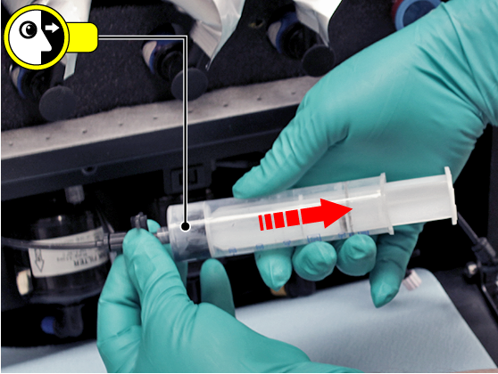 Trekk tilbake sprøytestempelet i trinn og vent til trykket jevner seg ut før du trekker mer for å forhindre overtrekking i sprøyten. Merk at kanalen for hvitt blekk kan trenge noe mer trekk for å overvinne trykket.