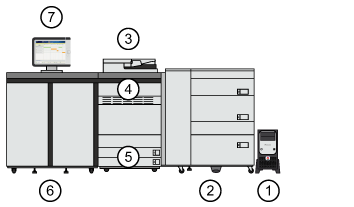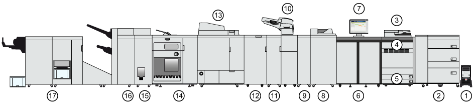 Exemplo de um sistema de impressão, ampliado com várias entradas e saídas opcionais|