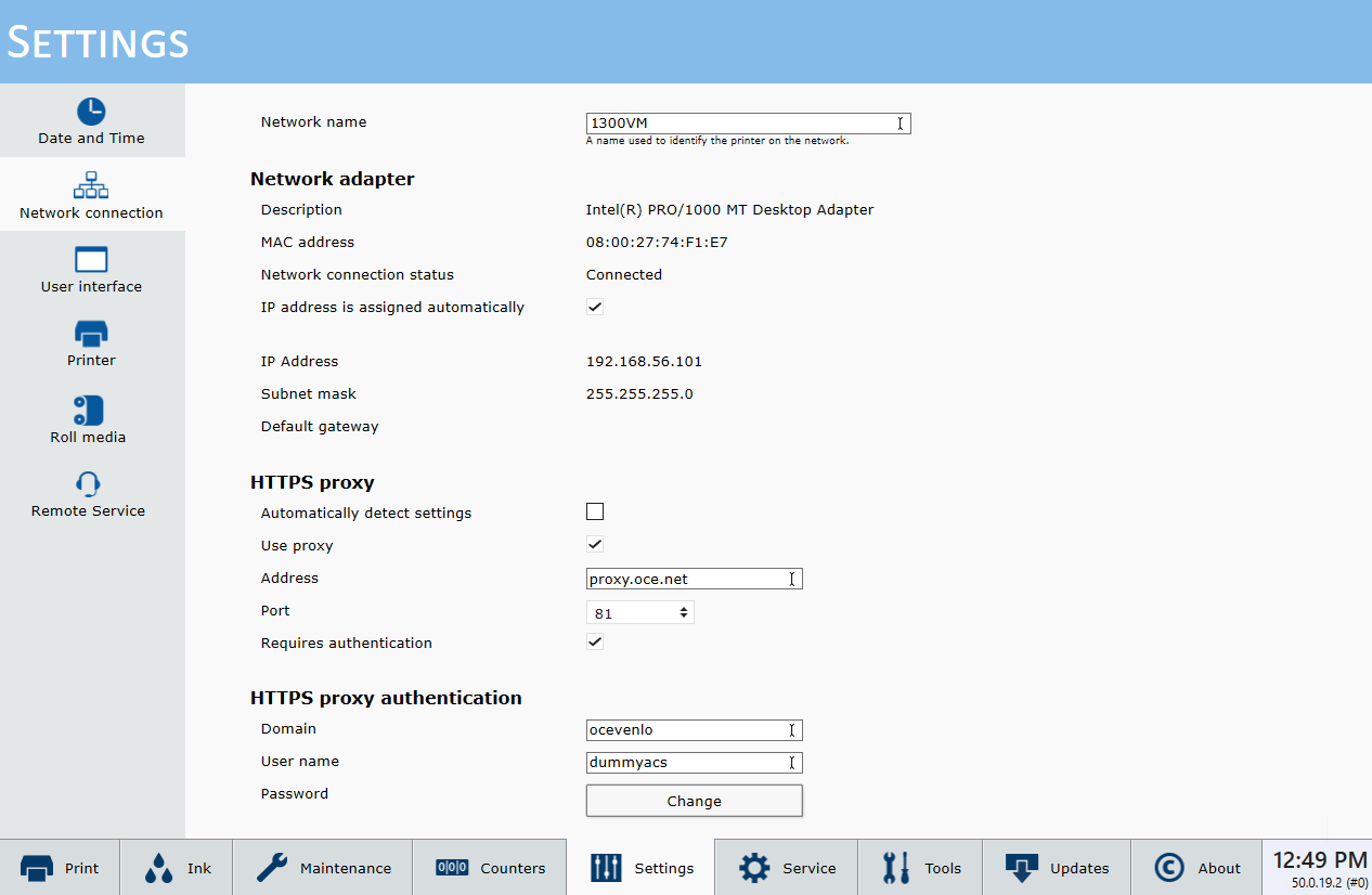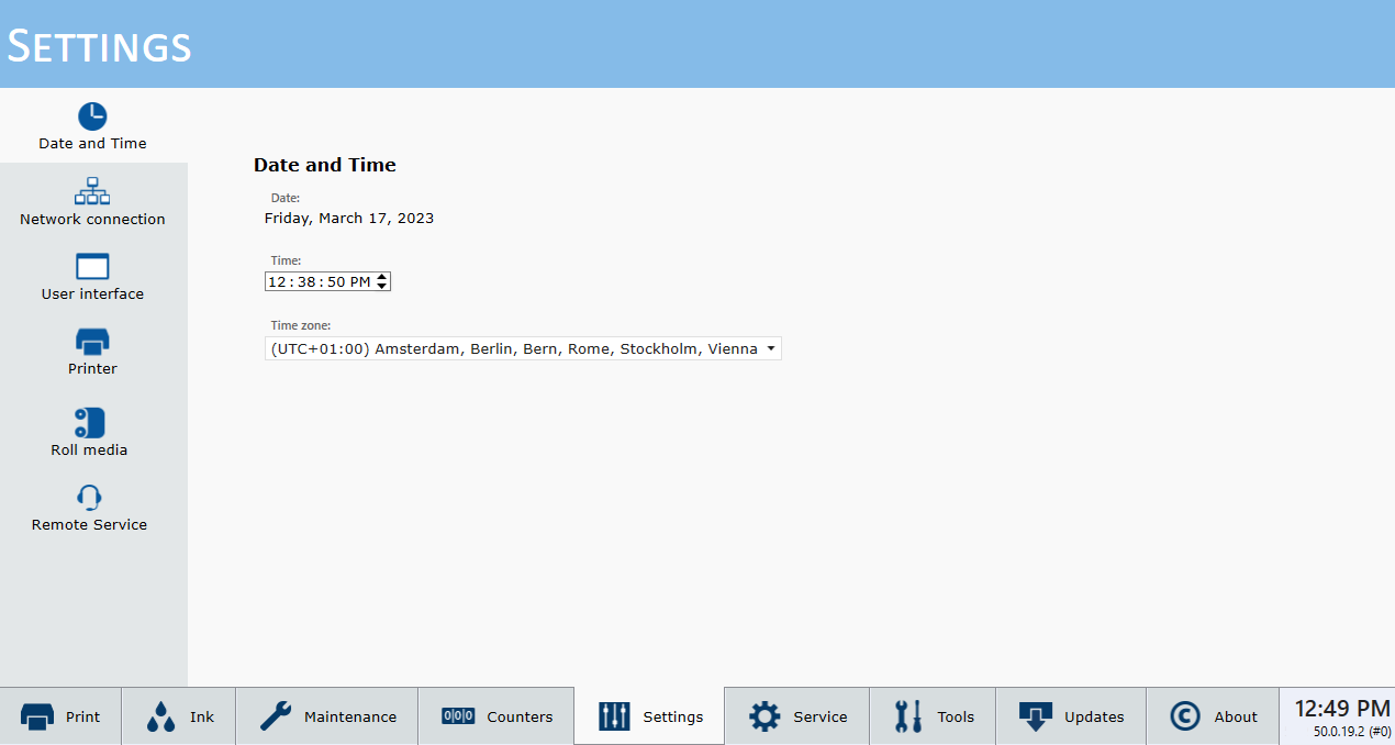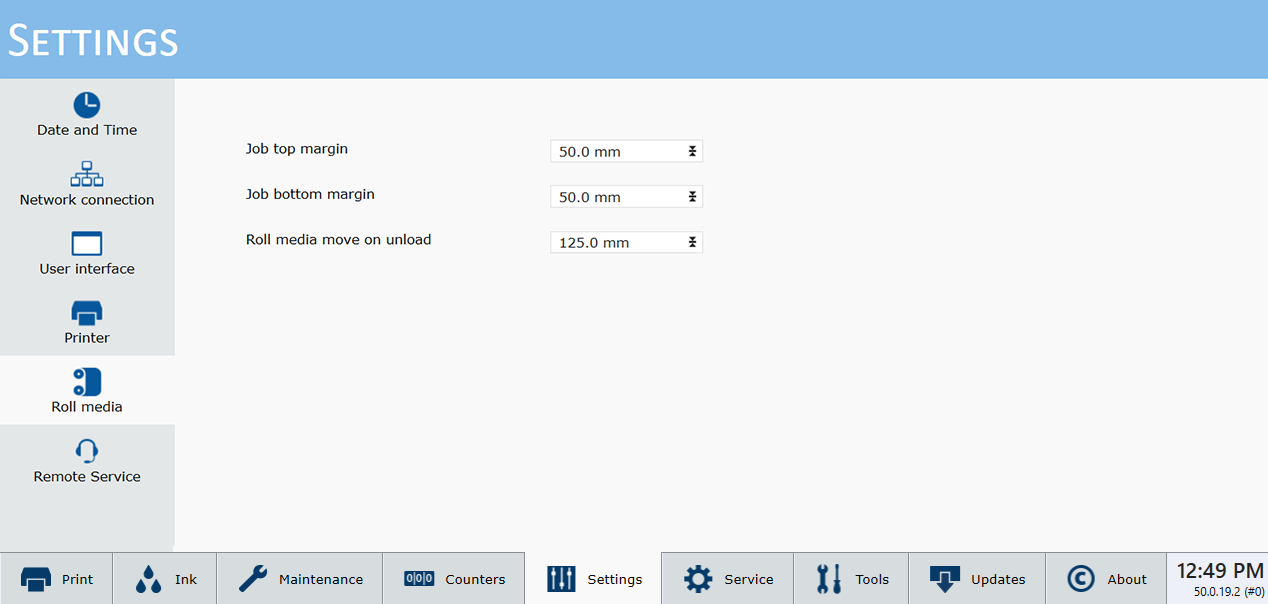 The Settings Module allows you to review and change the date and time, network connection settings, user interface configurations, printer settings and, if installed, the Roll Media settings.