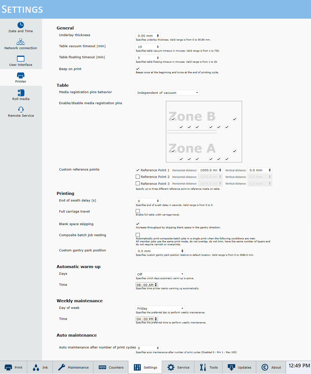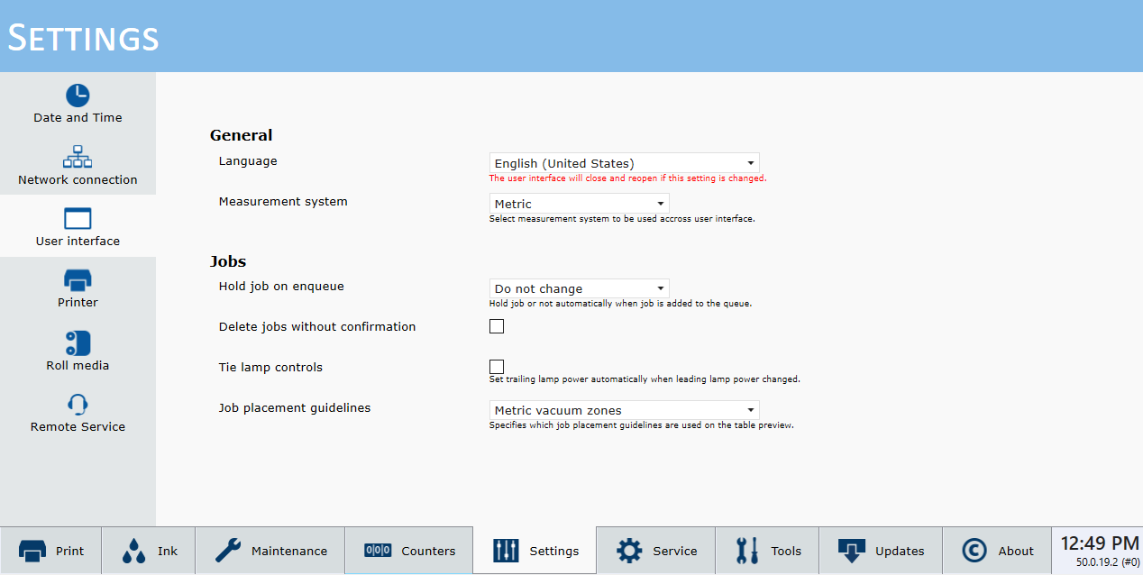 The Settings Module allows you to review and change the date and time, network connection settings, user interface configurations, printer settings and, if installed, the Roll Media settings.