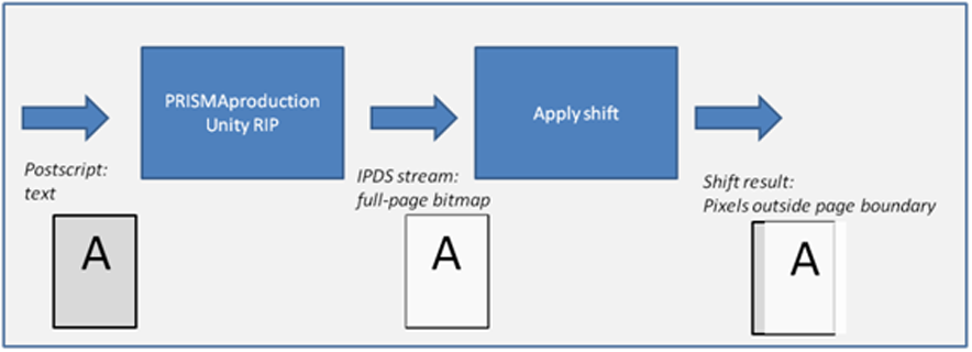 The occurrence of PEMs is related to the chosen workflow. When submitting PostScript jobs in IPDS mode through the host, e.g. PRISMAproduction, all pages in the job are translated to full-page bitmaps in the IPDS stream. This means that the bitmap is exactly the size of the A4 page. Any shift that occurs will immediately lead to pixels that are outside the page boundary and thus lead to PEMs, see the figure below.