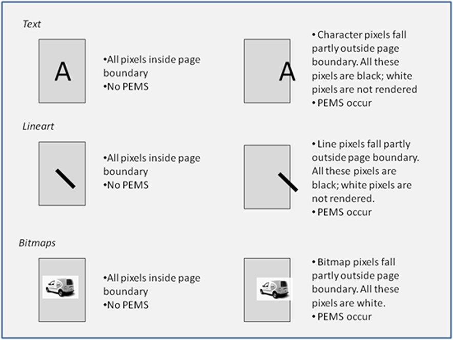 The figure below provides a brief explanation about when PEMs occur. As soon as a part of the printable data and/or objects are placed outside the page boundary, a PEM occurs on the sheet. A bitmap may consist of large parts of white pixels. The renderer also considers those pixels to fall outside the page boundary, and thus inserts PEMs.