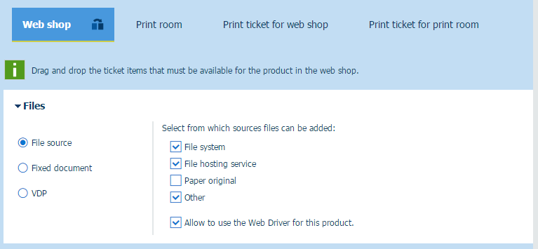 在 [文件] 部分中启用 [文件来源] - [文件托管服务] 选项。[文件] 部分在 [网上商店] 视图中可用。