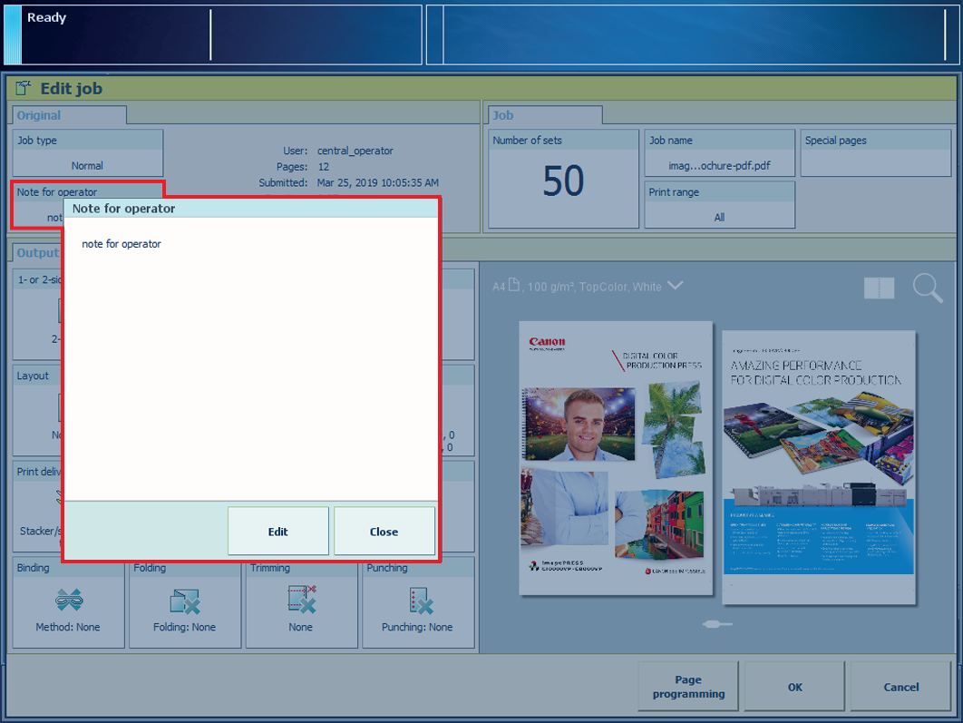 No painel [Original], toque em [Nota para o operador].