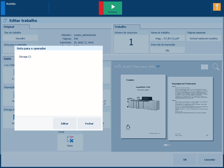 2. No painel [Original], toque em [Nota para o operador].