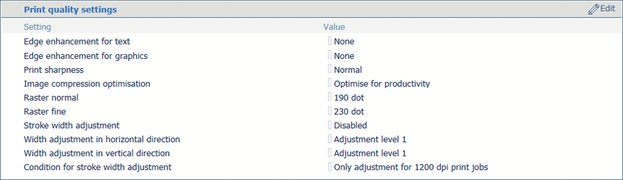 Utilizzare [Condizione per la regolazione larghezza del tratto] per indicare se si desiderano caratteri e linee più spessi per tutti i lavori o solo per i lavori da 1200 dpi.