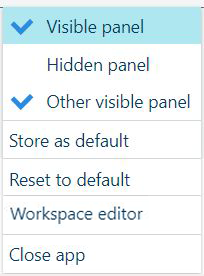 当鼠标光标位于工作区的右上角时,将出现一个菜单。当您单击三点菜单 后,将显示一个包含应用程序所提供的所有面板的列表。可见的面板标有勾号符号。此菜单中的其他条目是[存储为默认值] 和[重置为默认值] 。