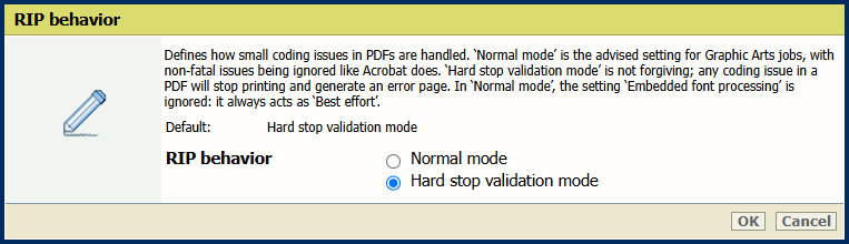 [Global rasterization mode] settingUse the [RIP behavior] setting to define how small coding issues in PDFs are handled