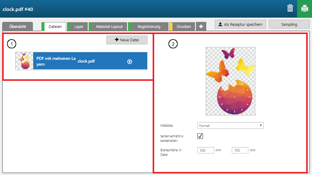 Hier können Sie neue Dateien importieren und die Größe der Dateien ändern.