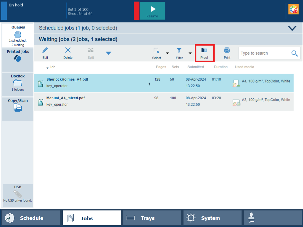 When you make a proof, the printer prints an extra set or record of the job. A copy of the job goes to the last position of the list of scheduled jobs. The original job remains in the list of waiting jobs or in the DocBox. The magnifying glass icon indicates a proof print.