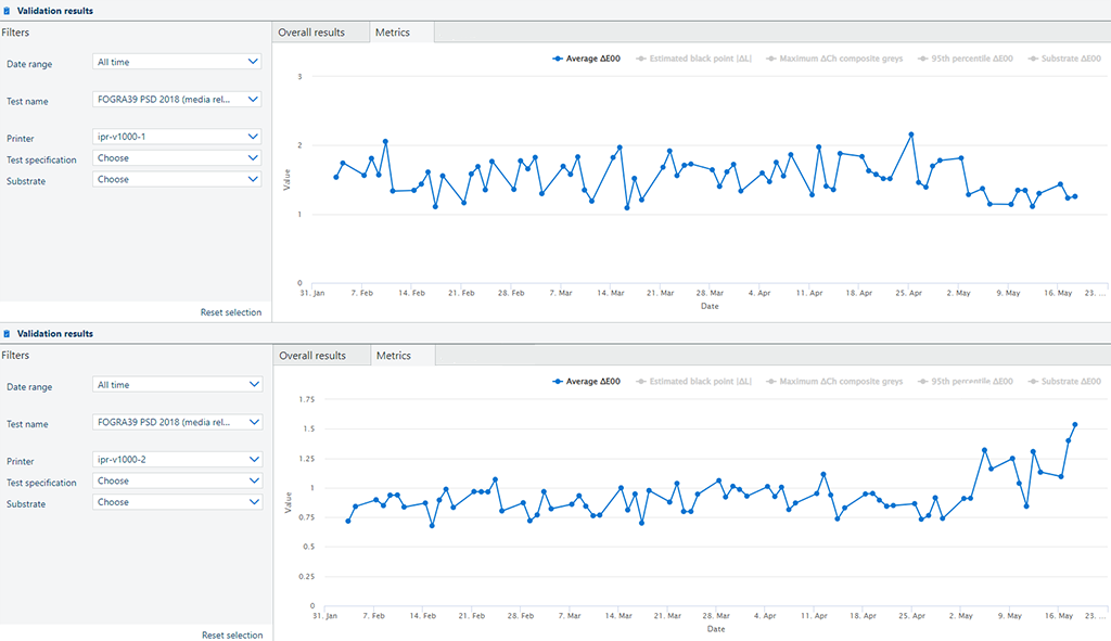 PRISMAcolor Manager には、複数のプリンター間で印刷されたカラーを比較する機能があります。そのためには、[測定基準] ビューを使用します。以下の手順に従って、2 台のプリンターの包括的な比較を行います。