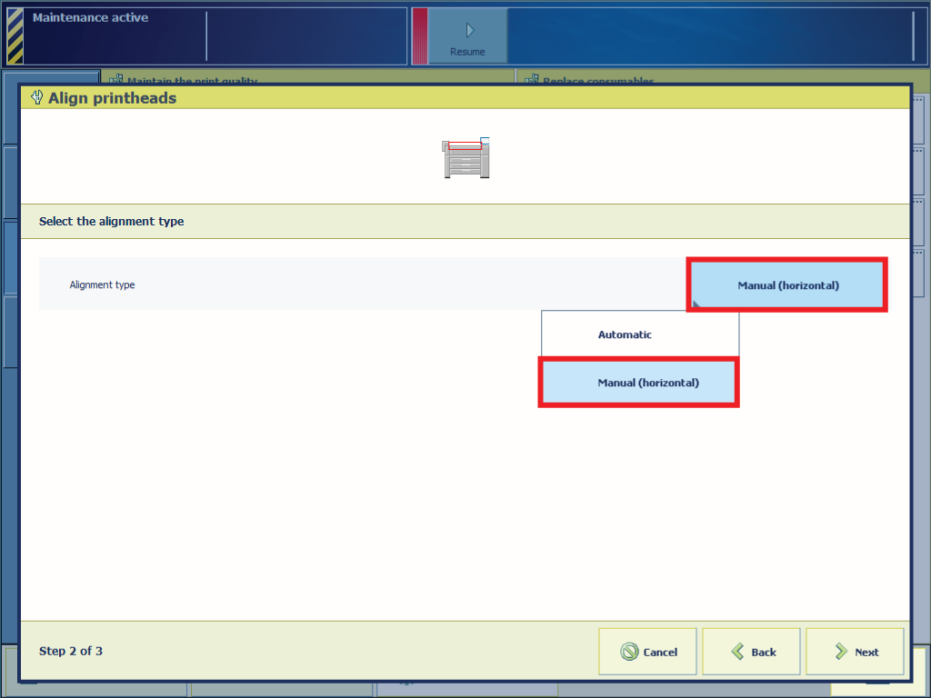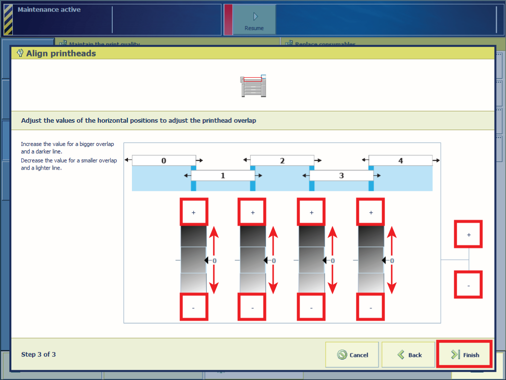 Print a suitable test print. If the problem is not completely solved, Identify the printhead transitions that need manual printhead alignment (horizontal).