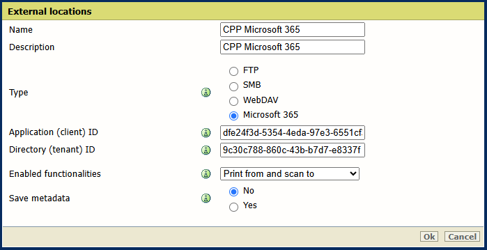 Sie können in WebTools Express Ihre eigenen externen Speicherorte vom Typ Microsoft 365 erstellen.