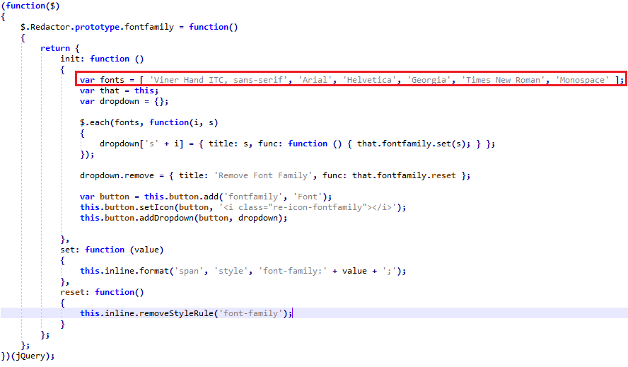 3. この JavaScript ファイルでフォントをリストしている次の部分を見つけます。