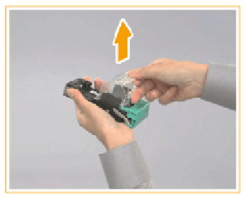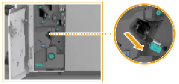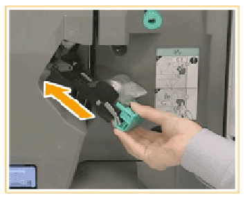 Удерживая картридж за зеленый выступ, извлеките его. Если блок сшивателя находится в дальней части устройства, достать картридж со скрепками может быть затруднительно. В таком случае поверните ручку, расположенную снизу слева влево, чтобы переместить блок сшивателя. |