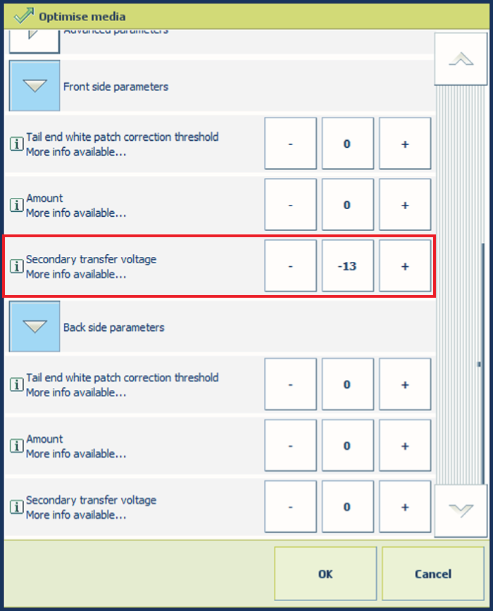 A hátoldal másodlagos átviteli feszültségének paraméterértékeA másodlagos átvitelifeszültség-paraméterek megadott értékeinek tárolásához érintse meg az [OK] gombot.