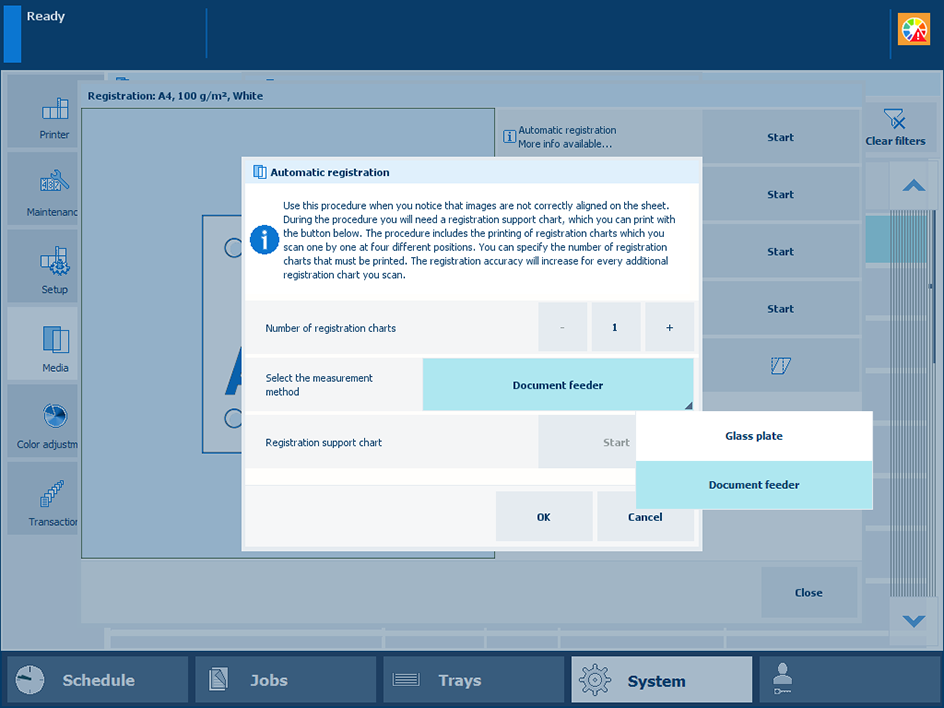 Automatic registration can be done via the glass plate, document feeder or sensing unit if they are present in your printer configuration.
